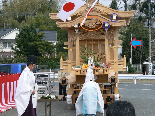 ハフ下の白く塗られた梁、中央に鳳凰があって(赤円内)、